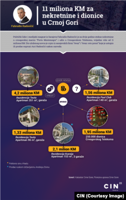 Politički lider i medijski magnat iz Sarajeva Fahrudin Radončić je za dvije godine u Crnoj Gori stekao nekretnine i udjele u preduzećima vrijedne više od 11 miliona KM. Toliko su koštala četiri luksuzna apartmana u crnogorskoj marini „Porto Montenegro“ te udjel u Crnogorskom Telekomu.