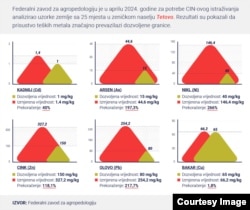 Analize tla iz marta 2024. godine pokazale su u naseljima Tetovo i Pehare prekomjerno zagađenje zemlje teškim metalima od prašine iz dimnjaka. U tlu su pronađene prekogranične vrijednosti metala štetnih za zdravlje: arsena, olova, cinka, kadmija, nikla i bakra. Analizu uzoraka zemljišta sa 50 različitih lokacija − u baštama te ispred škola, ambulante i vjerskih objekata i uz ulice u Tetovu i Peharama − za potrebu CIN-ovog istraživanja je uradio Federalni zavod za agropedologiju.