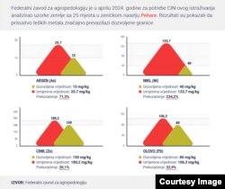Rezultati testiranja su pokazali da su svi uzorci tla zagađeni arsenom, olovom, cinkom, kadmijem, niklom i bakrom i to u dvostruko do trostruko većim vrijednostima u odnosu na zakonske granice u FBiH.