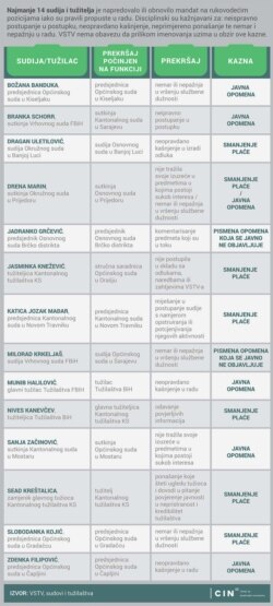 Imenovanje je provelo Visoko sudsko i tužilačko vijeće Bosne i Hercegovine (VSTVBiH) i u odlukama je navedeno da su se u tom postupku cijenili odnos prema radu, radni rezultati i ponašanje. Međutim, istraživanje Centra za istraživačko novinarstvo (CIN) pokazuje da su uglavnom zbog toga disciplinski kažnjavani.