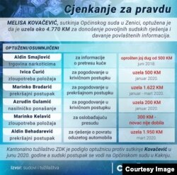Na osnovu anonimne dojave o njenim vansudskim aktivnostima, Tužilaštvo ZDK je pokrenulo istragu i prikupilo dokaze protiv sutkinje Kovačević. Optužena je za zloupotrebu položaja, primanje dara i nagrade, a suđenje je počelo u novembru na Općinskom sudu u Kaknju.