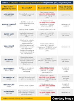 Na sudovima u BiH trenutno se vode postupci protiv najmanje 16 advokata zbog krivičnih djela počinjenih u vezi s poslom. Neki od njih su ranije bili suspendovani zbog pritvora ili sudskih mjera zabrana rada, dok trojica trenutno ne rade. Te mjere su, u skladu s entitetskim zakonima o advokaturi, provodile advokatske komore.